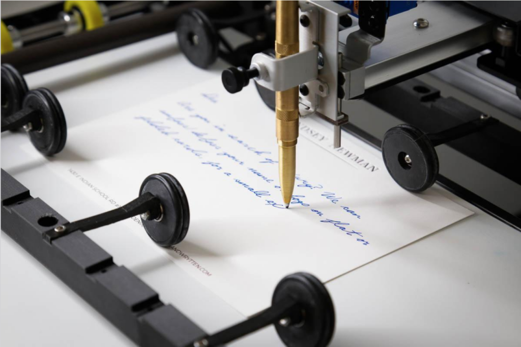 Handwrytten’s 185 robots hold ballpoint pens to craft and automate the mailing of more than 15,000 pieces of mail a day.